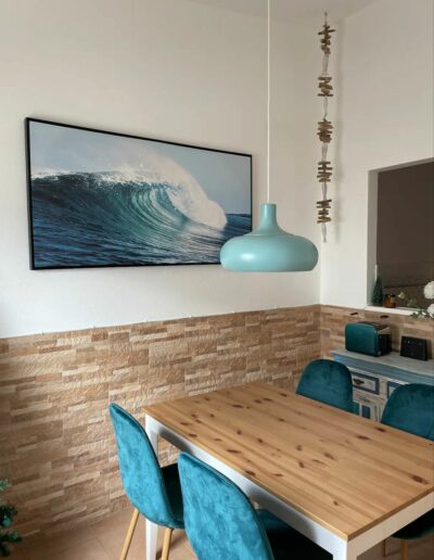 Schnelles Glasfaser-Internet. Fernseher mit Chromecast, Arbeitsplatz mit 24 Zoll Bildschirm (Ohne PC/Laptop) und Bürostuhl, Klimaanlage, Handtücher und Bettwäsche ist vorhanden. Die Küche ist voll ausgestattet mit allem was man zum Kochen und Essen braucht. Hängematte und Bambus-Hänge-Schaukel auf dem Hauptbalkon und Sitzgarnitur sowie kleiner Tisch und Stühle auf den Neben-Terrassen sind vorhanden.
